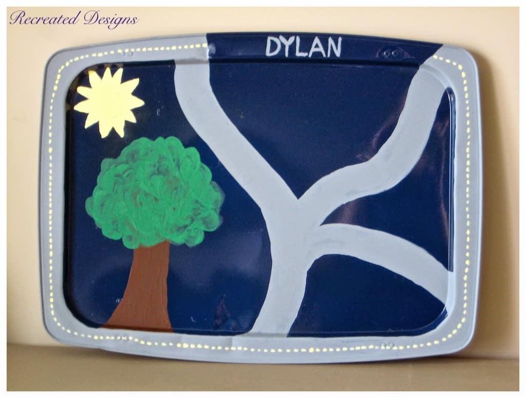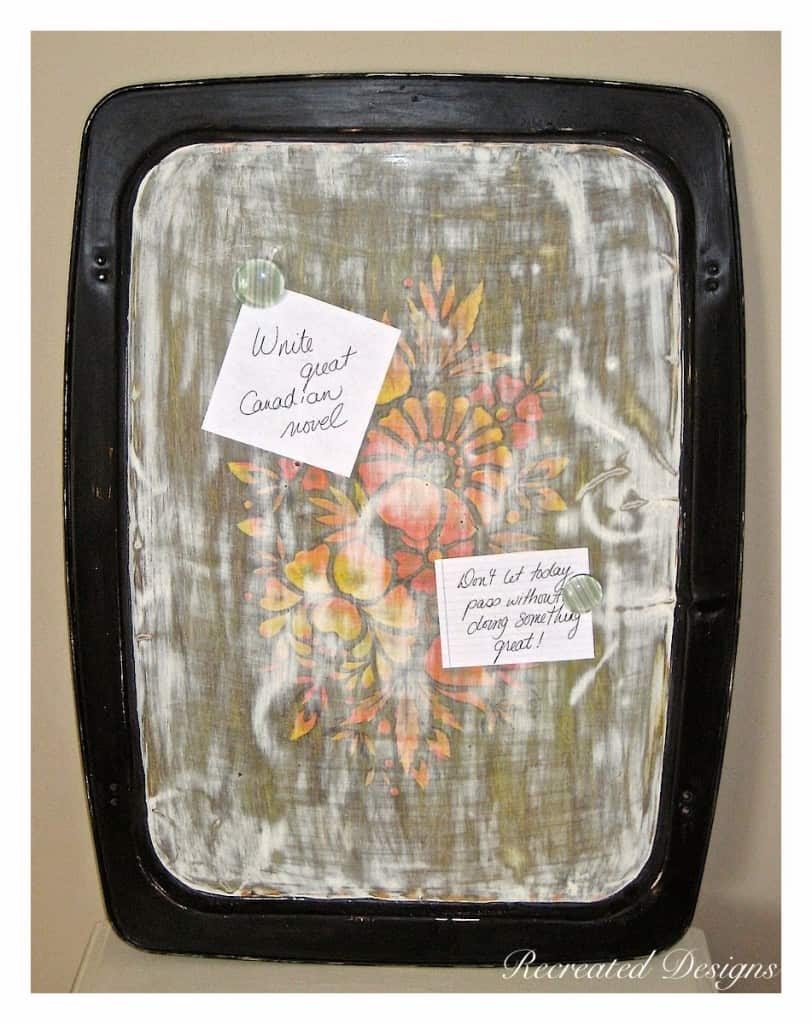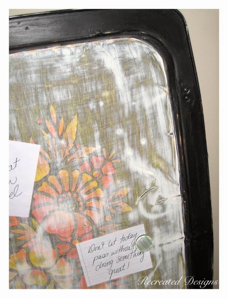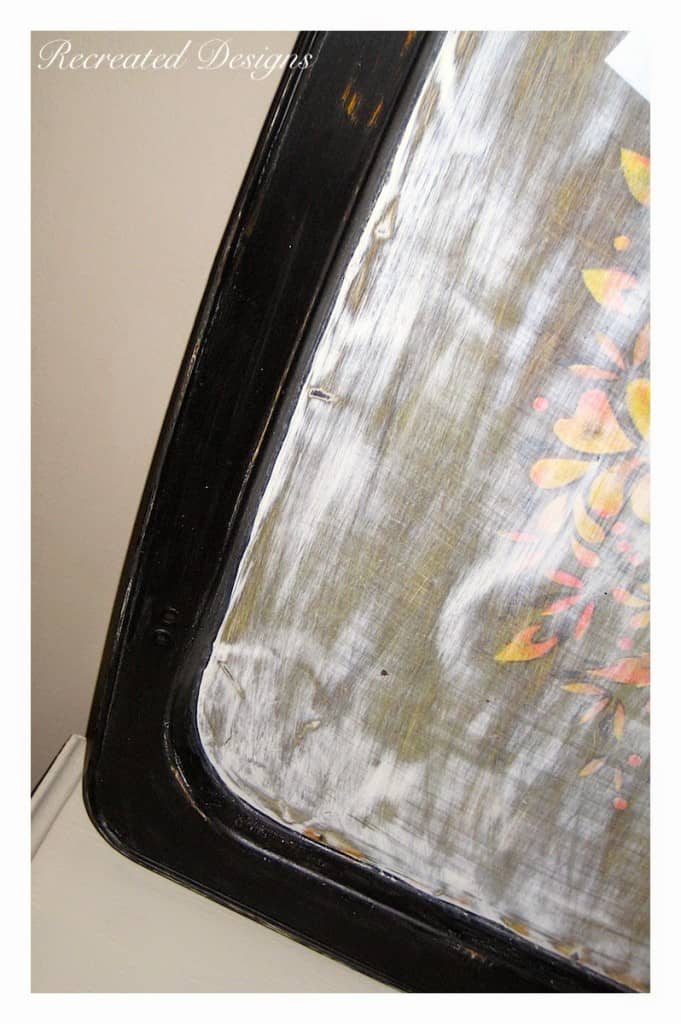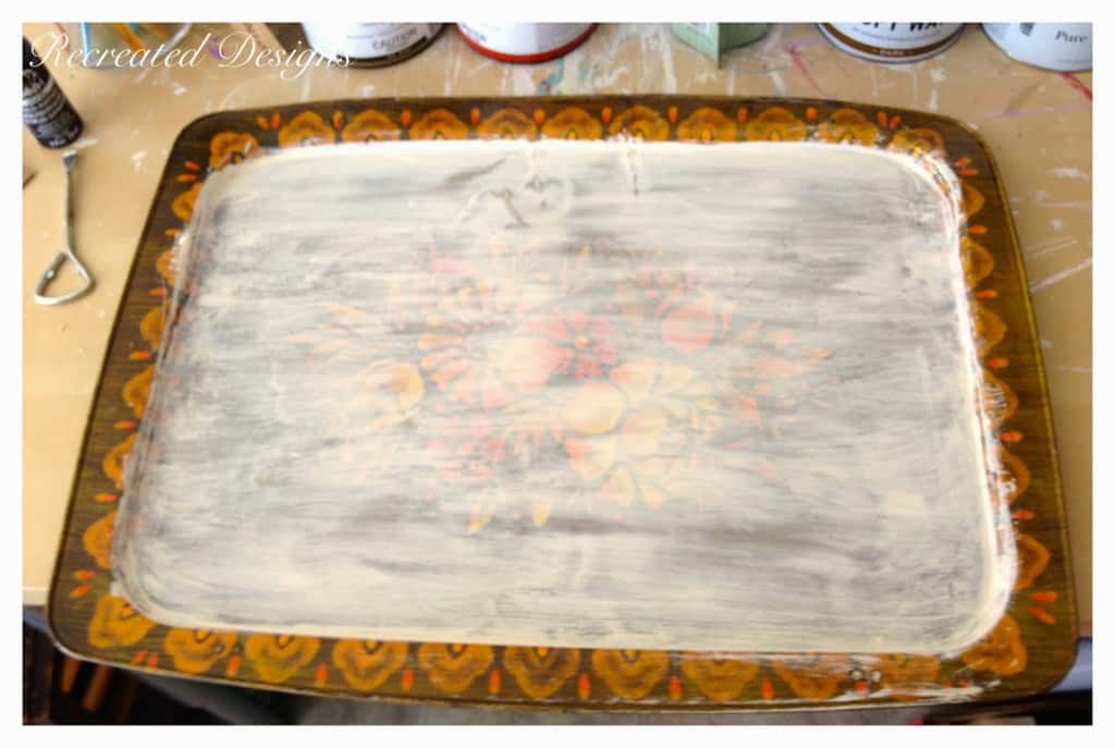 After throwing around some ideas, I decided to make a memo board out of hers.  I wanted to save some of the integrity of the design, as that was particularly important to her, so I diluted some Chalk paint into a wash for the inside area of the tray.After covering the inside, I used a Rustoleum paint to cover the outer edge of the tray.  In order to give it a more aged look, I used sandpaper to distress all of the paint once it was dry.  Because the TV tray was metal, it was perfect for magnets and easily converted into a memo board for her office.The remaining 2 trays were going to be given to her sons and she wanted them to be usable and fun.