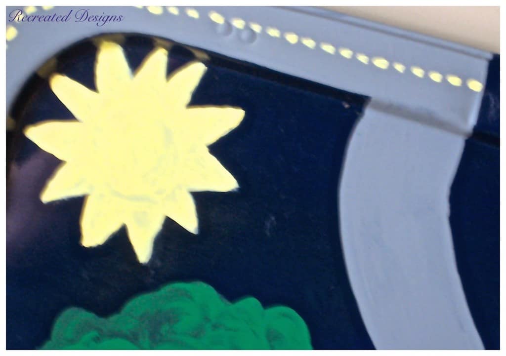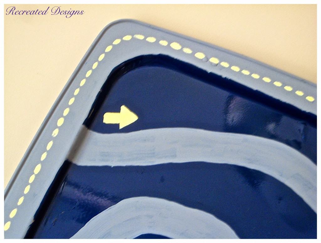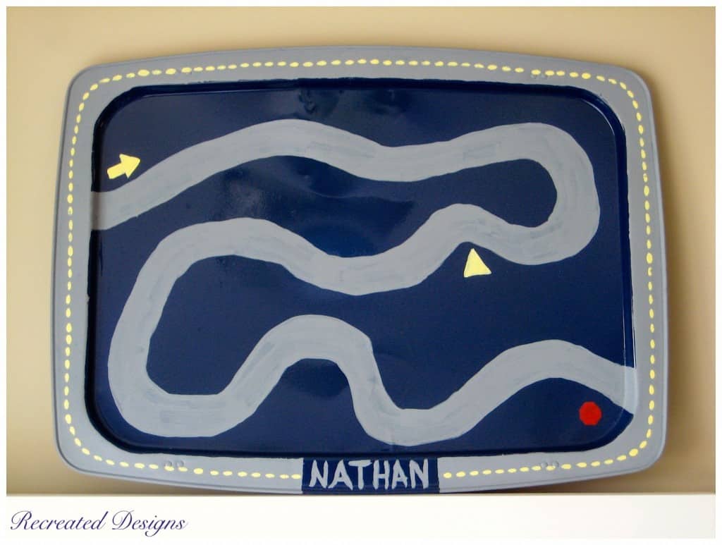 I covered each with a coat of Rustoleum spray paint in a beautiful blue colour and then painted roads on each.  The boys can both hang their trays on the wall like art and then take them down to drive their toy cars on them.  It was the perfect pairing for little boys 😊
