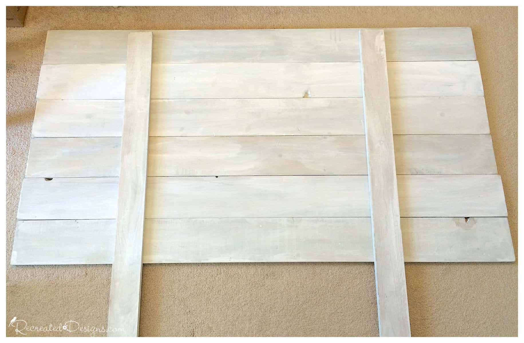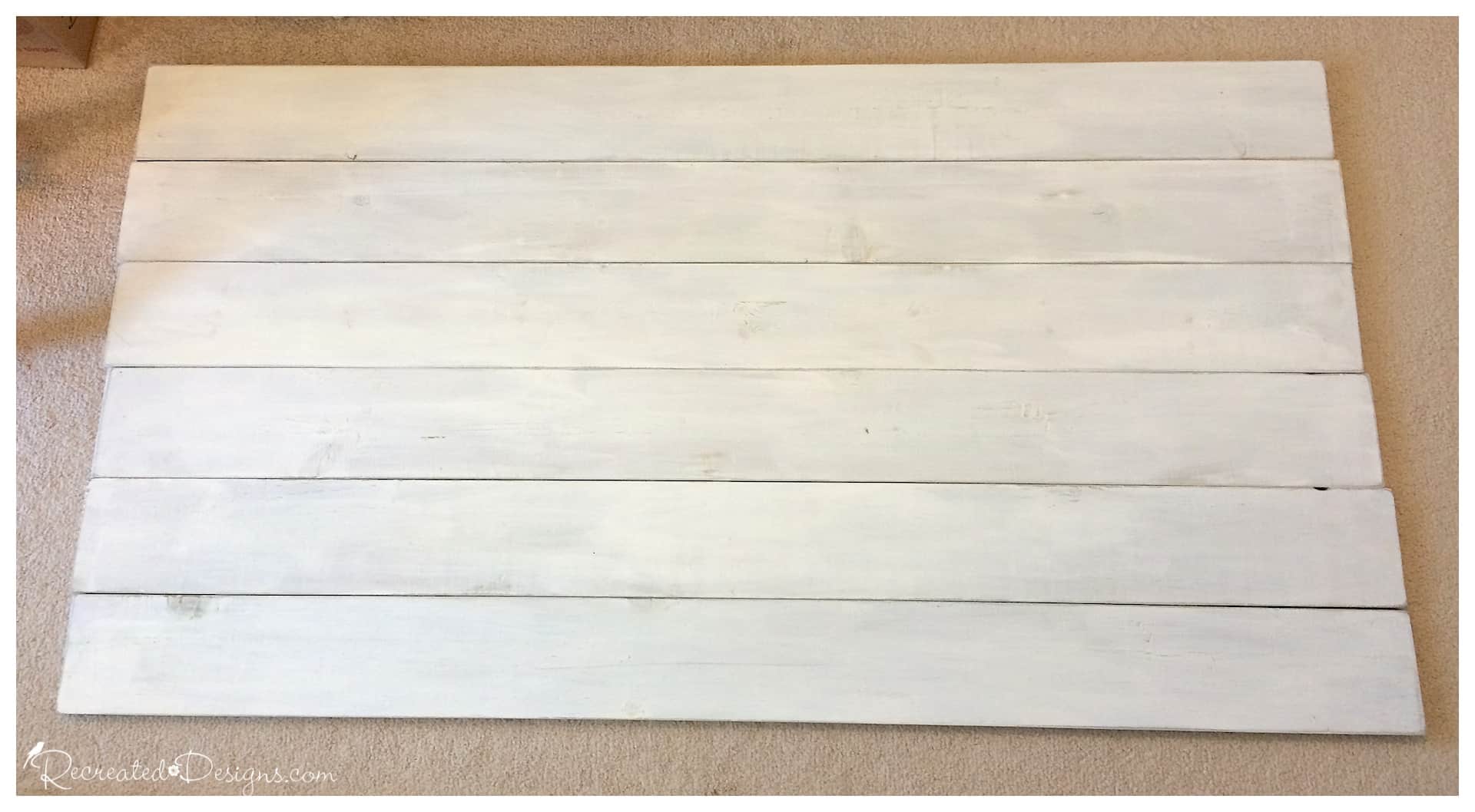To finish the headboard, once all of the wood pieces are painted and sanded, layout the newly painted wood and arrange it in the order you would like them.