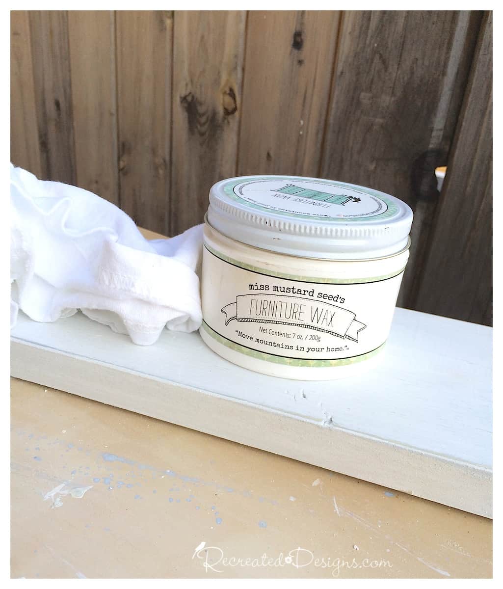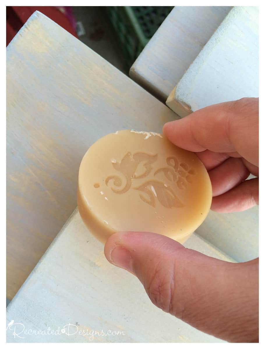 Rub the edges and corners with a wax puck or block so that when the coat of white Milk Paint is added, it won’t adhere in these spots and the grey will show through.