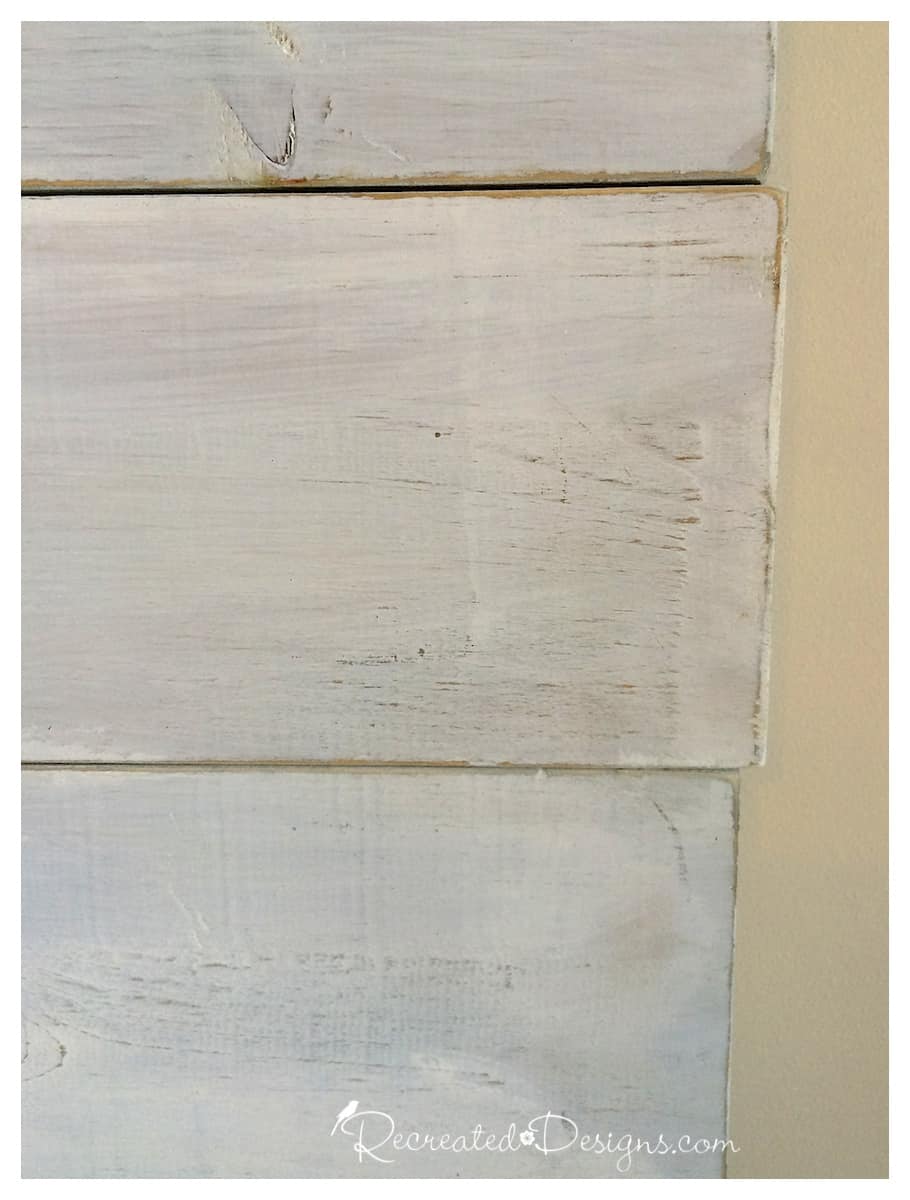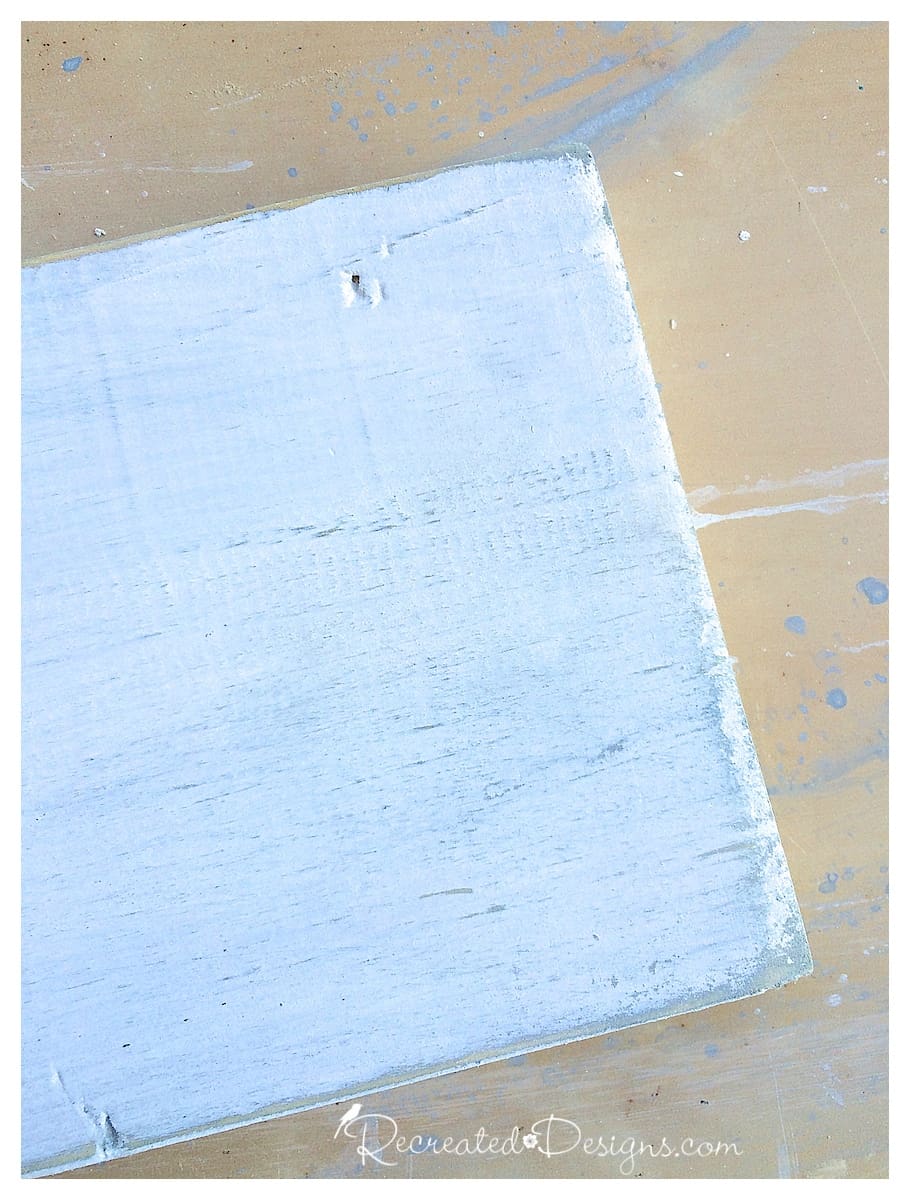 After each board is given a wash of gray paint, each one is painted with white milk paintuntil all of the boards are painted. The layering of the different colored paint allows you to create a look that is reminiscent of an old piece of furniture that has been painted many times over the years. When the paint layers have completely dried, lightly sand the edges and corners to reveal the color underneath. Light sanding also brings out the beauty of the dings and dents you created making the wood look old.