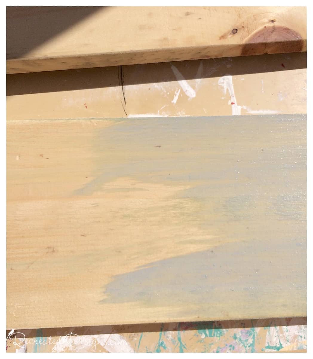 Once the wood has been roughed up, give it a wash of grey milk paint to make the wood look like aged cedar.