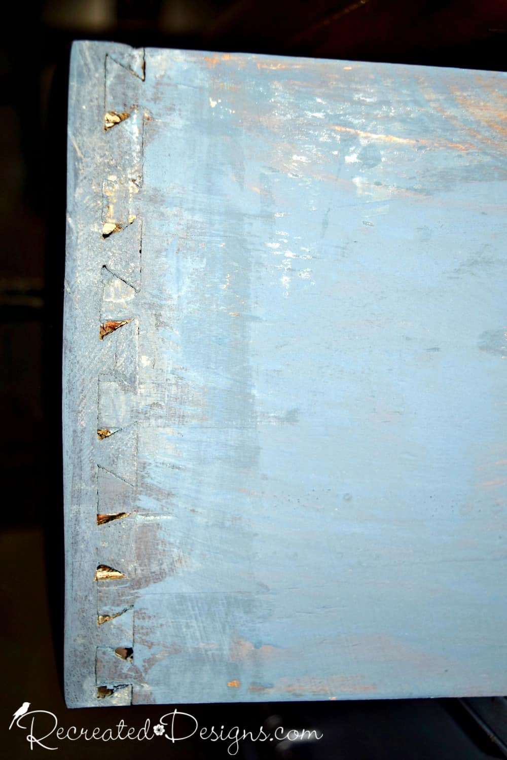 dovetailing on an old drawer painted blueDovetails – these will usually indicate that the piece is handmade and is of an older age
