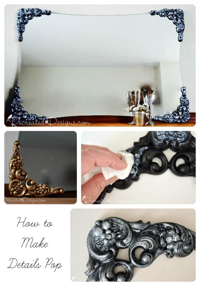 I used [easyazon_link identifier=”B017OABR6Y” locale=”US” tag=”recredesig20-20″]Fusion Mineral Paint Metallics in Pearl[/easyazon_link] for the highlighting. beautiful silvers with vintage mirrorWith the combination of a dark undertone, a metallic silver to reflect the light and light touches to finish it off, it is so easy to make details pop.  vintage mirror painted with Fusion Mineral Paint and a beautiful silver cupbeautiful vintage silver cup with flowersvintage plastic mirror corners painted with Fusion Mineral PaintBy making those details pop, it completely turned this mirror into a modern piece that would look amazing in any room.Making the details pop on a vintage mirror with paint
