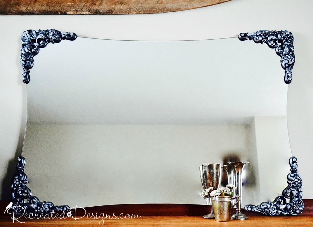 I used [easyazon_link identifier=”B00O2JNZ3Y” locale=”US” tag=”recredesig20-20″]Fusion Mineral Paint in Coal Black[/easyazon_link]. painting and rubbing on Fusion Mineral Paint in SilverMirror corner painted with Fusion Mineral Paint in Coal Black, Silver and PearlNext, paint or rub on some silver metallic paint.  You don’t need to cover all of the black… let some of it peek through.