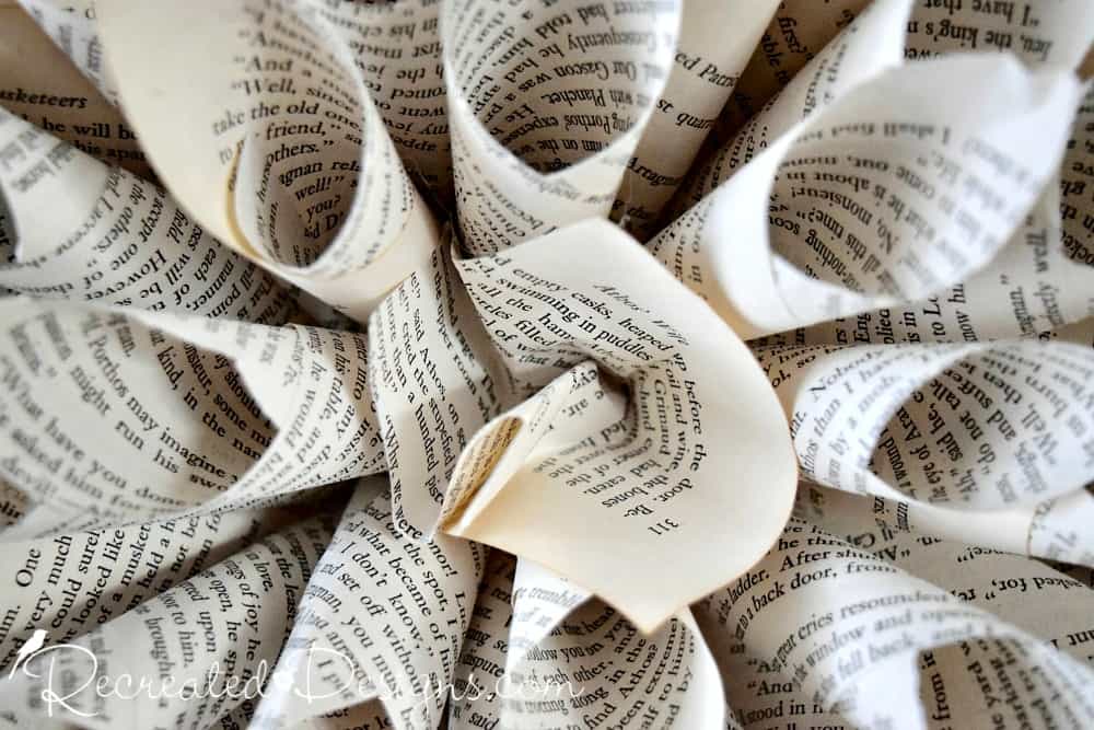 Last Friday when I did my latest Facebook Live for Hometalk I switched the location in which I filmed it. For this last demo, (making a Spring wreath out of a Thrift store frame) I shot the Live in front of a wall that had two pieces of reclaimed wood and a book page flower on it. Many of you noticed the book page flower behind me and sent requests for directions on how to make it.