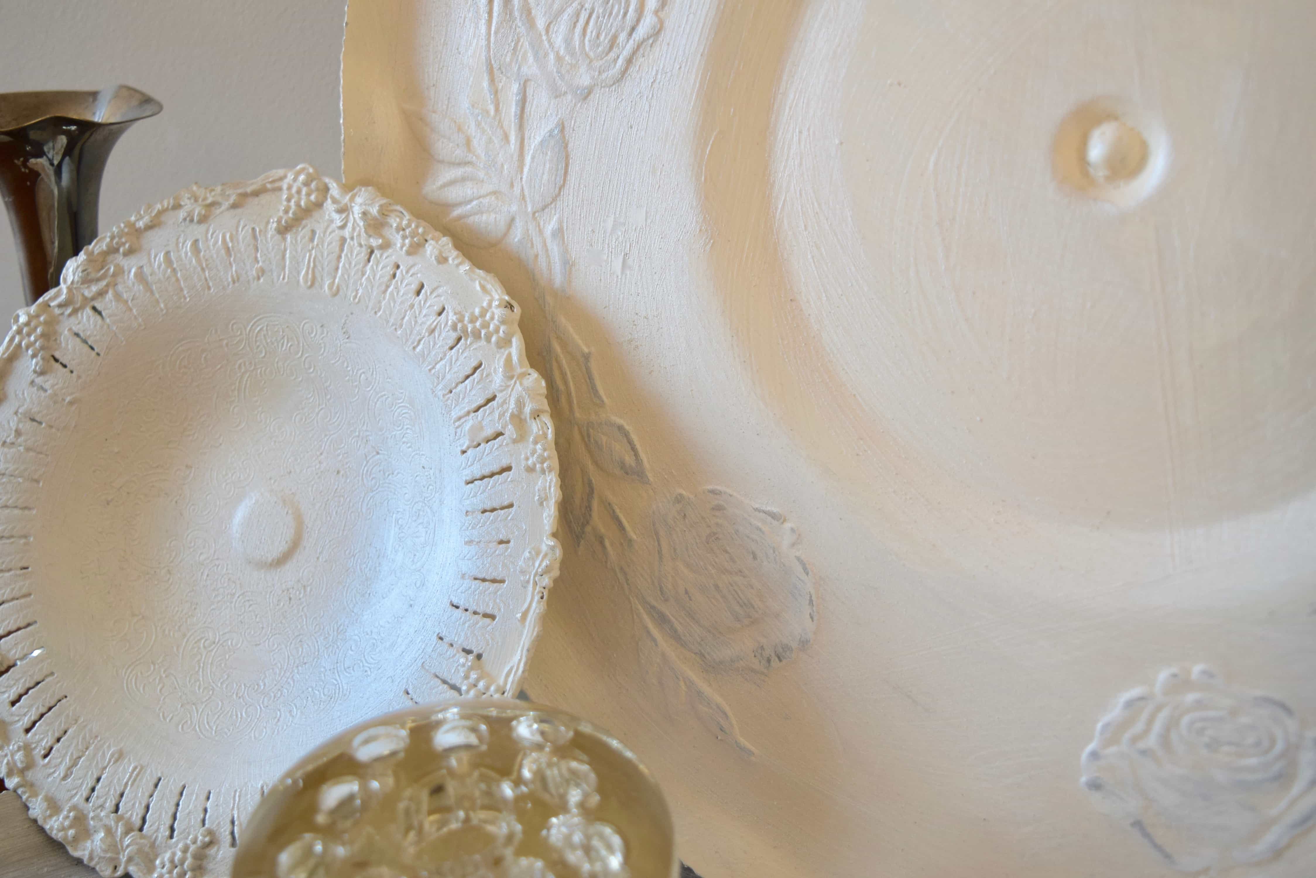 Fusion was great for this project because of its beautiful finish and built-in top coat.Once the trays had two layers of paint, I lightly sanded the high points of the pattern. I wanted to see the silver peek through so the sandpaper took off just enough paint to make that possible.
