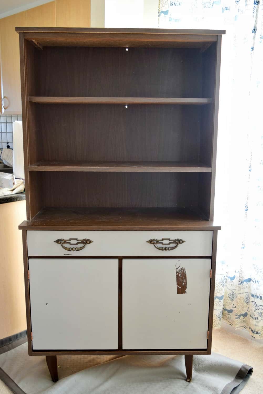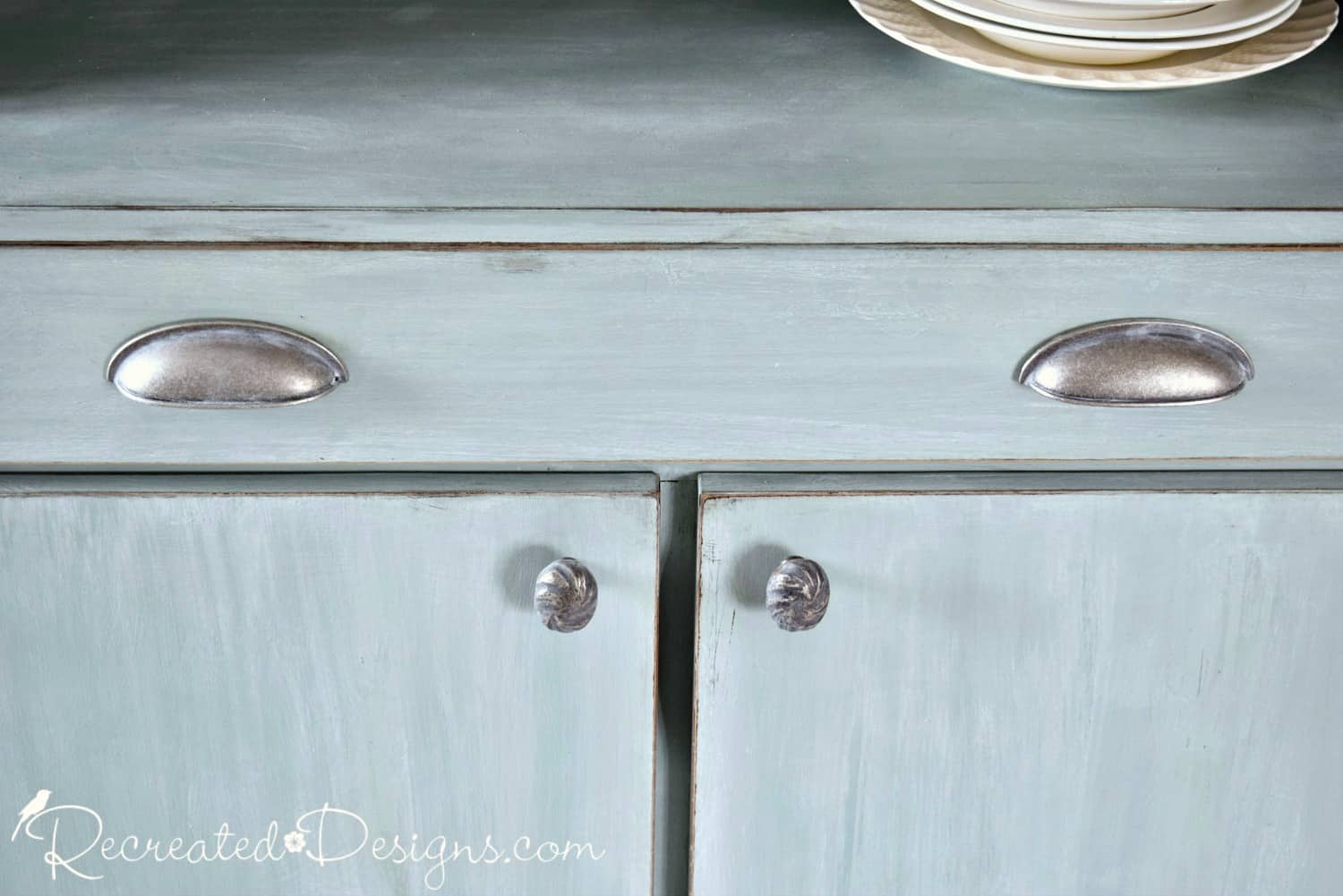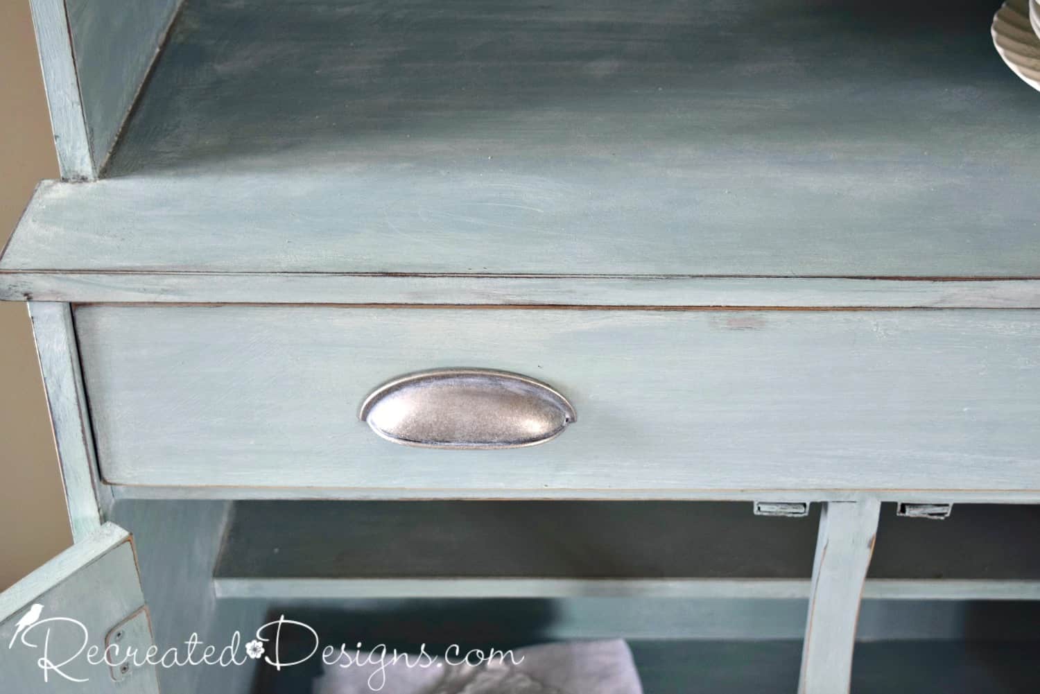 The makeover of the old hutch started with two coats of Annie Sloan Chalk paint in Duck Egg.