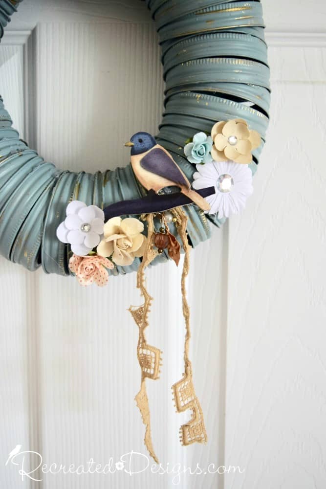 To add a touch of whimsy to the wreath, I pulled out an assortment of paper flowers, a bird, and some of my Grandmother’s vintage lace from my stash.