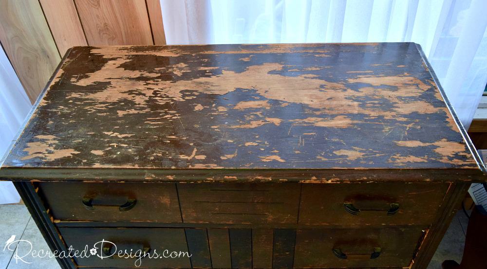 The top was incredibly damaged buuut I could see that there was some beautiful wood living under that flaking, chipping finish. Wood that was just begging to brought back to life. And, not only was the wood gorgeous but the dresser had its original wheels and hardware!
