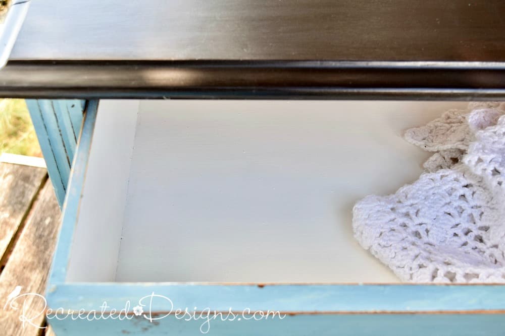 Like all of my furniture pieces, I painted the inside of the drawers. They always feel so clean and fresh to me with a new coat of paint. These were painted with two coats of Miss Mustard Seed’s Milk Paint in Ironstone.