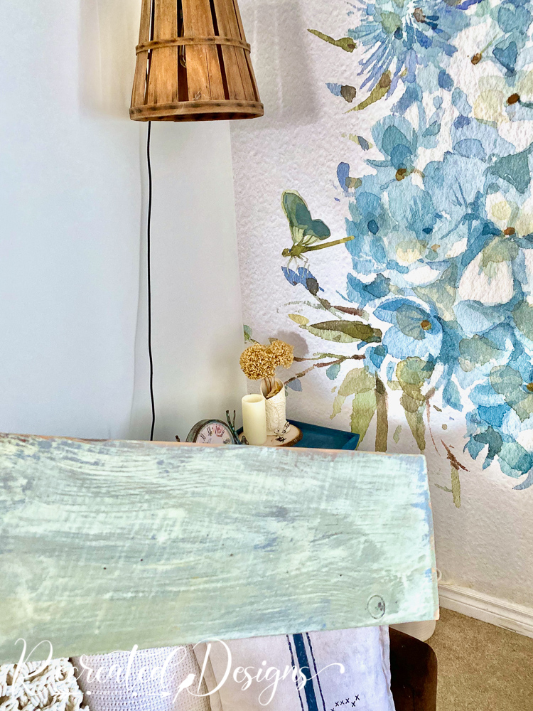 Wanting to tone down the blue paint on the shelves, I gave them a coat of Milk Paint by Fusion in Vintage Laurel. I am so in love with this soft green (and the blue peeking through) as it played off the colours in the wall mural beautifully.