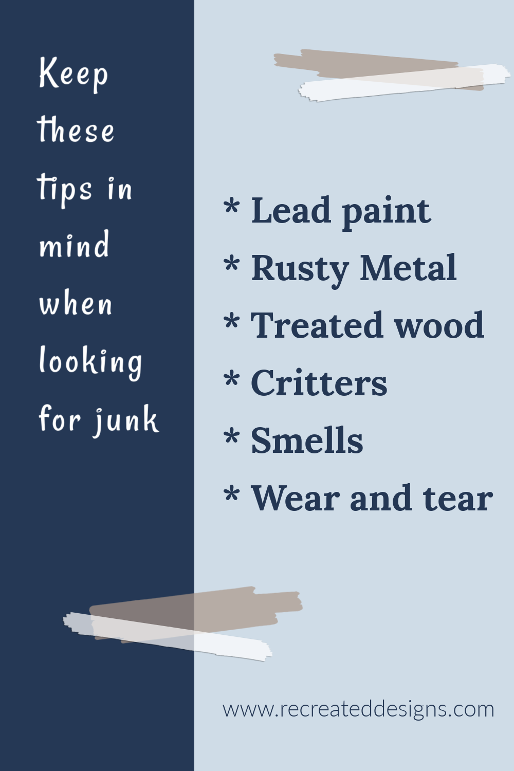When you are looking for junk or old wood, always be careful that you don’t cut yourself on any rusty nails, screws, or metal. Be prepared as well that if you take home something with old hardware you will have to find a way to safely remove it and this can sometimes be tricky the old a piece gets.