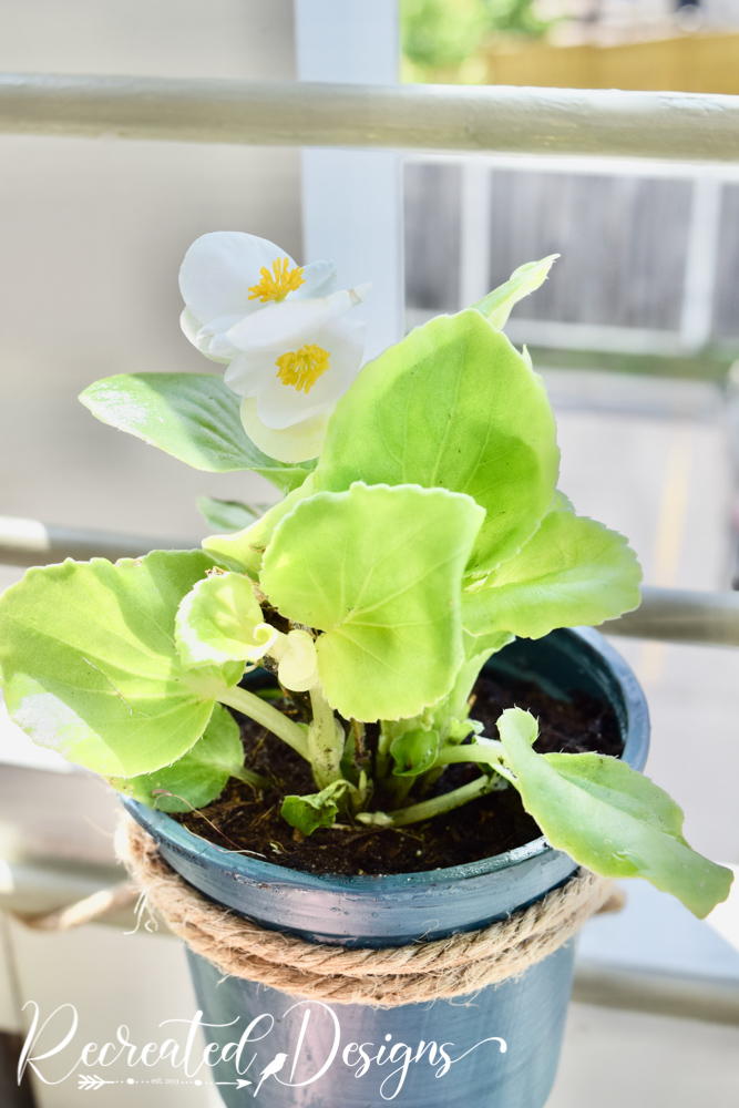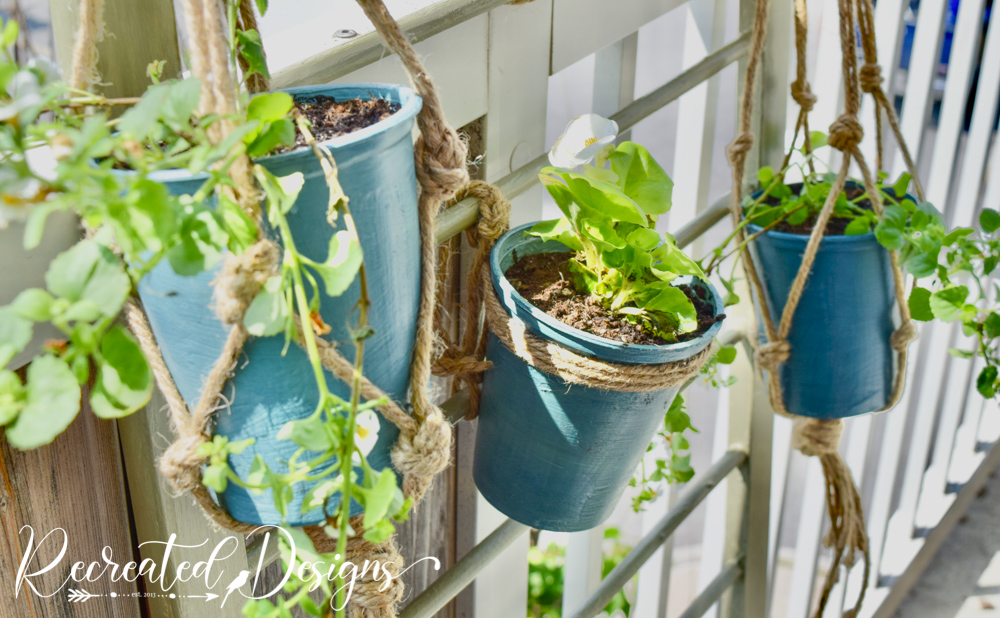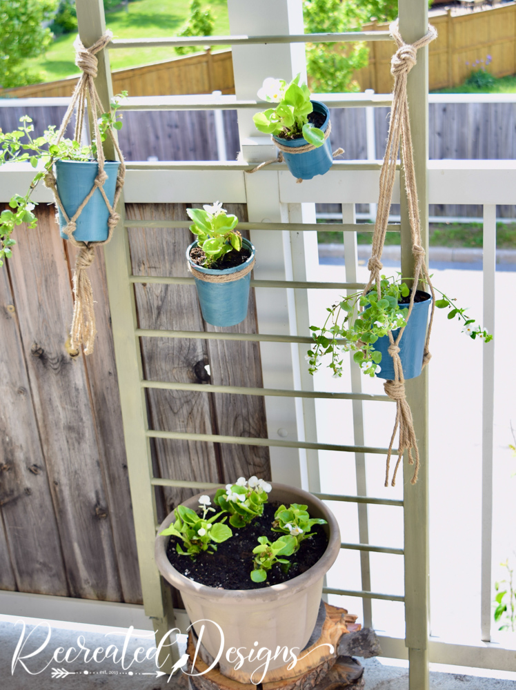I wanted a variety of pots going on, so several of them I tied with thick jute twine to the crib rails, and several I hung with these quick macrame jute planters.