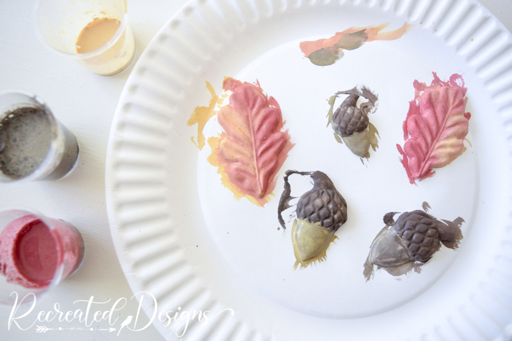 To give the little leaves and acorns some color I painted them while the clay was still wet or soft to the touch.