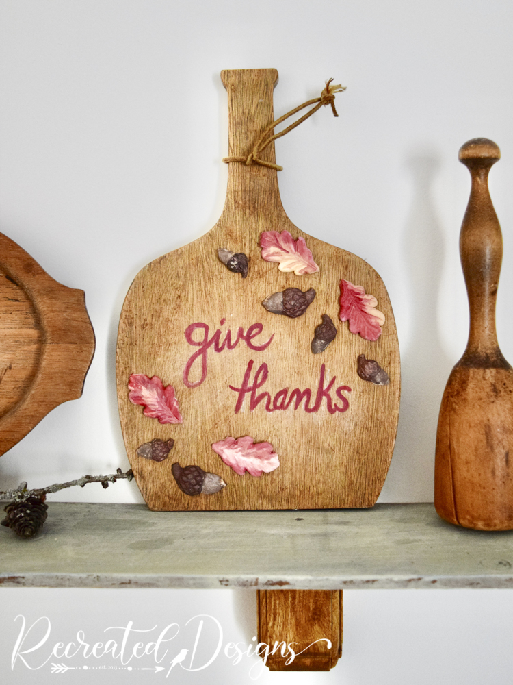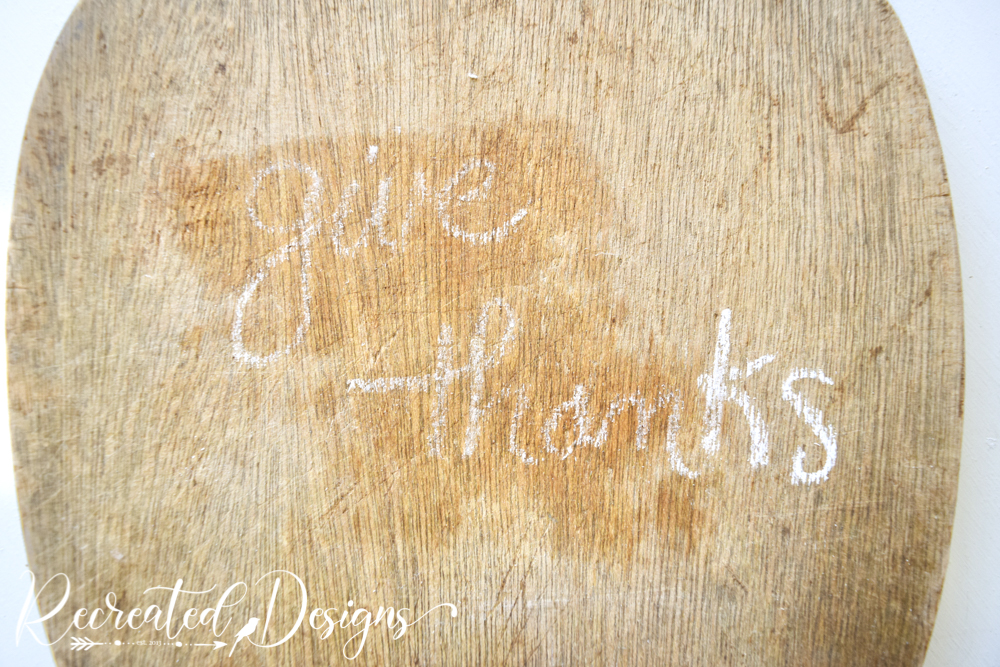 Before adhering any of the impressions, I used a piece of chalk to write the script I wanted. By using the chalk, I was able to “erase” it and rewrite it until I got it how I wanted it. When I had it how I liked it, I painted over it with the same red milk paint as the leaves.